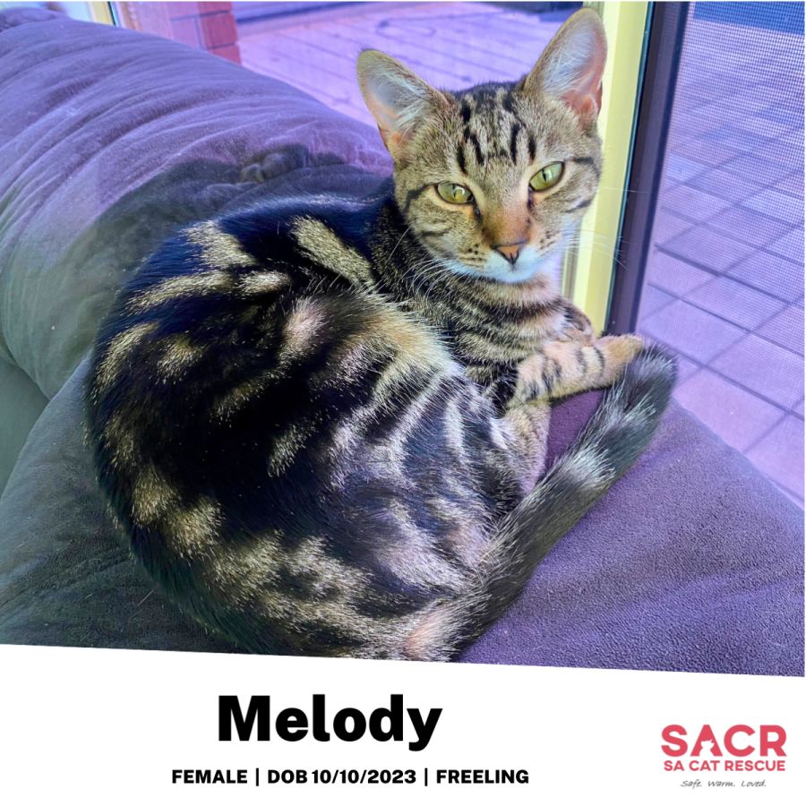 Melody's adoption fee is $120 which includes desexing, microchipping, parasite prevention, and F3 vaccination.