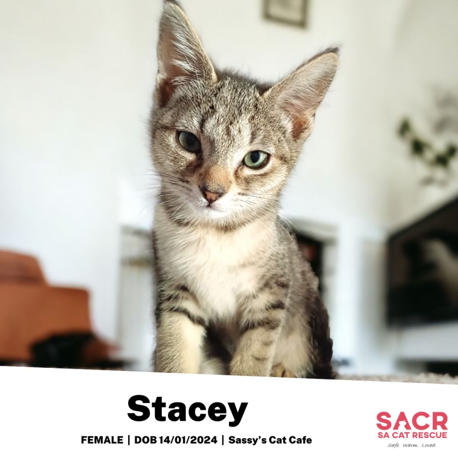 Meet Stacey – a charming, friendly, and outgoing girl kitty who is eager to explore the world. She is a lady with character and love to spare. Stacey came to us with her siblings and with her magnetic personality, she has always been the most sociable of the group. Her playful spirit and boundless affection make her the perfect companion.