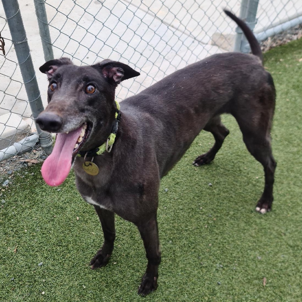 Introducing Hallie, a retired racing champion turned loyal companion. This magnificent Greyhound now seeks a laid-back lifestyle filled with cuddles and coziness, swapping her fast-paced track life for a more playful and relaxing home routine.