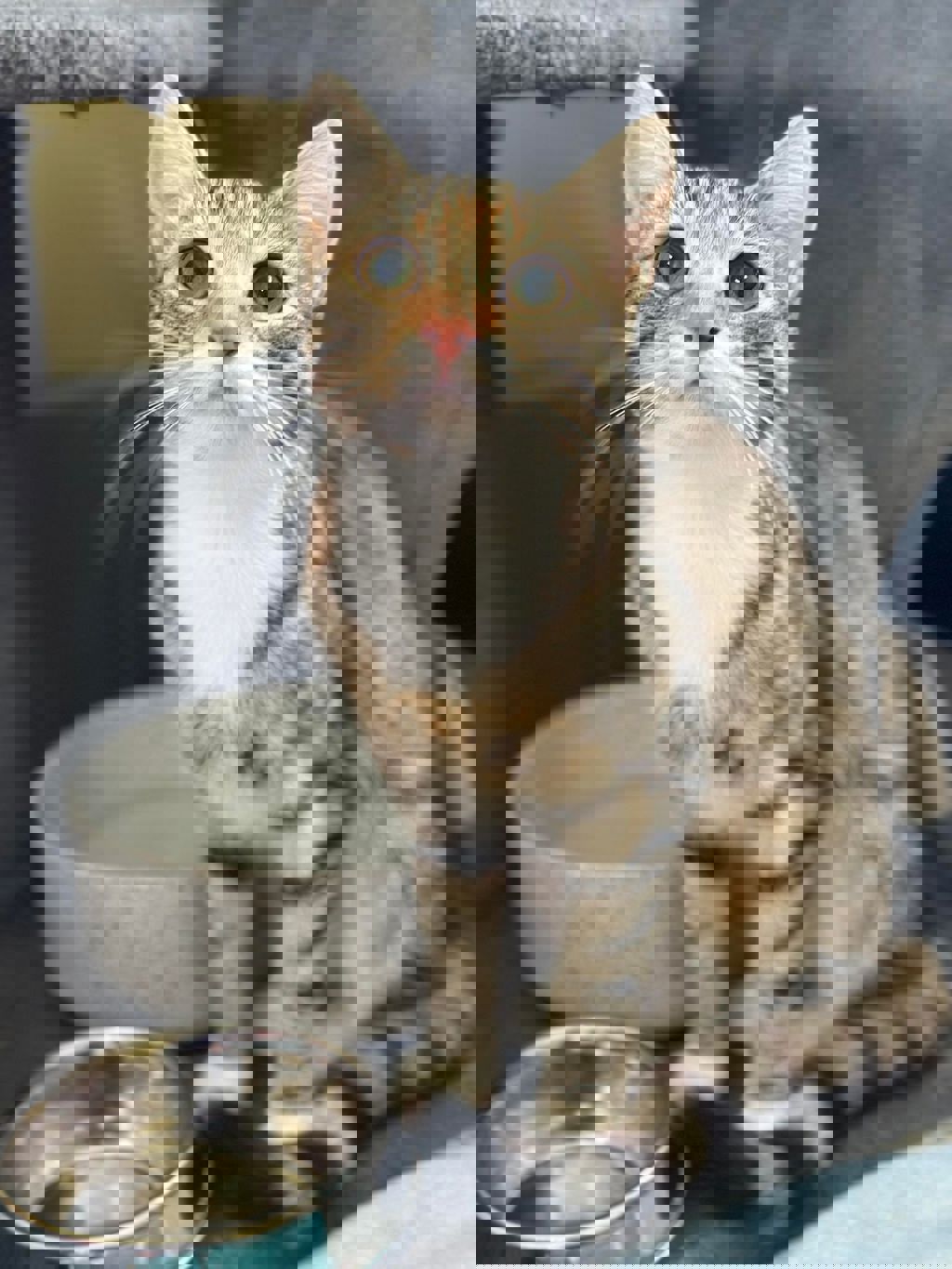 Despite her assertive appetite, she's a sweetheart at heart, suited for older children who understand her quirks and a more relaxed household, as she can still be very nervous around new people and busy situations. With her newfound confidence and playful spirit, she'd thrive in a household with 1-2 other cats, where she can enjoy both companionship and plenty of tasty treats. If you're looking for a charming and spirited addition to your family, this delightful young kitten might just be the perfect match.