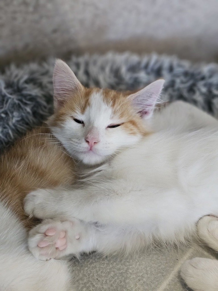 Munch has a hard time keeping his eyes open for the camera, as napping is just too hard to resist regardless of what is going on around him. His typical day generally consists of snuggling up close to his siblings, lying on his favourite plush bed and finding the most inconvenient spot to fall asleep.