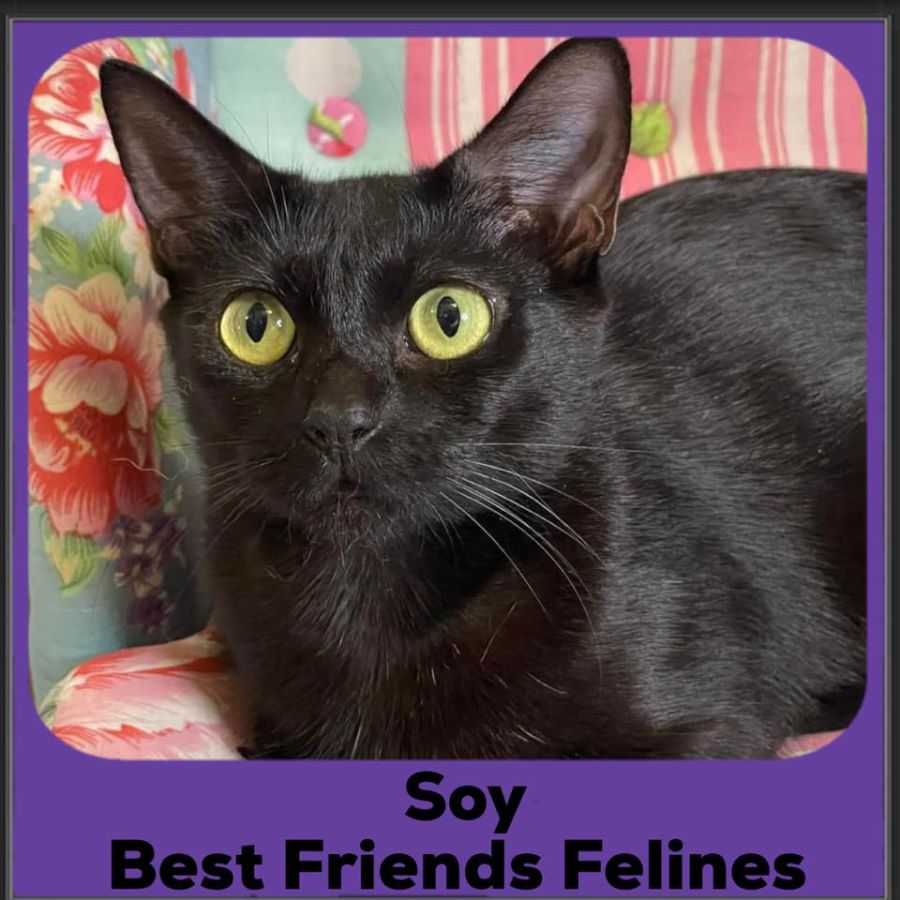 The stunning Soy came into care with her 2 young kittens and has been nothing more than a sweet delight to be around. Her sleek black coat with a smattering of white hairs is comforting to sit and just lightly caress her from head to tail.