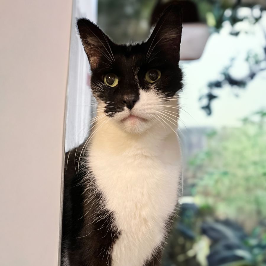 Meet Butter, a sweet and sensitive tuxedo boy who has recently found his freedom from a research facility. At 9 years old, Butter is ready to spend his retirement in a loving home where he can be an indoor-only cat, which is non-negotiable for all our feline friends. Butter is elegant and handsome, not one to demand constant attention but cherishes cuddles and gives the best head butts. While he’s not a lap cat yet, he’s learning to enjoy it. His favourite pastime is chasing his fluffy mouse on a string, showcasing his playful side.
