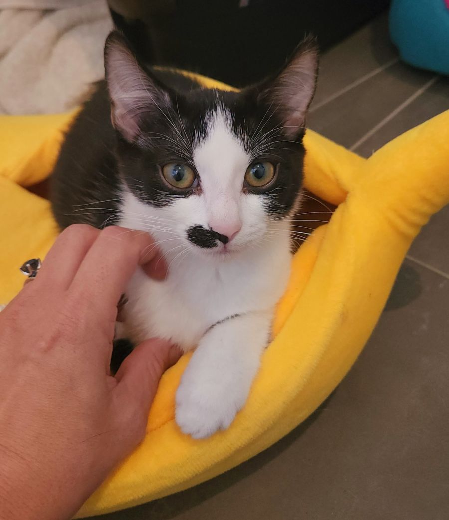 She also loves a good cuddle session, seeking out your lap after a playday full of adventure. Her affectionate personality shines as she snuggles up close, purring contently as you run your fingers down her sleek tuxedo coat.