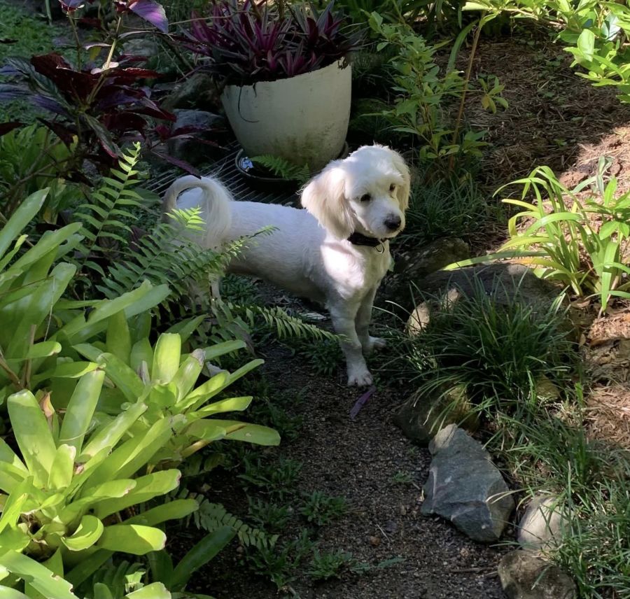 Chilli is more an inside than outside dog, but she absolutely loves going for a walk and will stand on her hind legs to get her harness on. She plays happily with different types of dogs at the local dog park; however, she is not so happy to meet other dogs when she is on leash, but she is getting better when she encounters them. Her adopters need to be aware of this but because she is very intelligent and loves food and treats, she is easy to train. As she is a poodle X, Chilli will require regular clipping and grooming, and she loves being brushed.