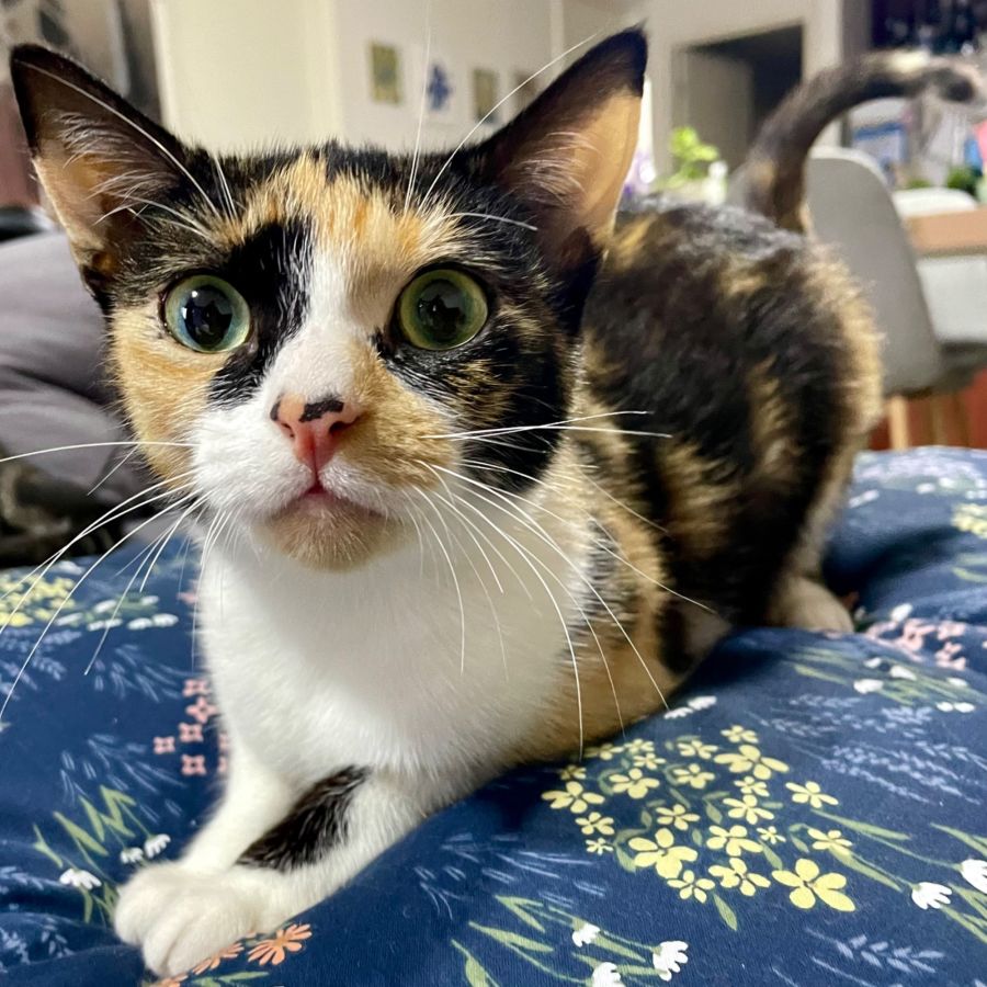 Meet Winnie, a charming calico lady with captivating green eyes. Winnie has a love for life that shines through her joyful cat antics and her love for playing with toys. Her energy is infectious, and she'll undoubtedly make you smile with her cat games and agile movements.