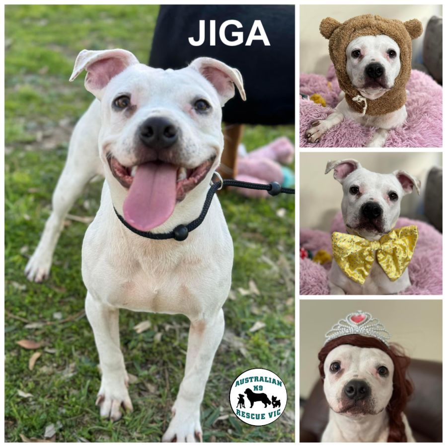 If you’re looking for al little furry friend who's always up for fun and adventure, Jiga is your guy. He is a white English Staffy x with a heart of gold and a zest for life with a huge love of dogs and toys. Jiga is a little size Staffy x probably a bit of Bulldog who is currently 17.5 kilos so we see him only being a small med boy at full growth.