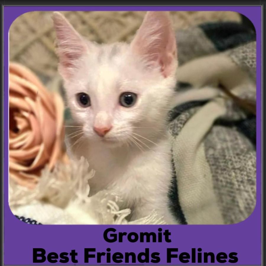 Gromit is predominantly white with only two black flecks on his forehead. Gromit is a champion at using the litter tray and has lovely manners.