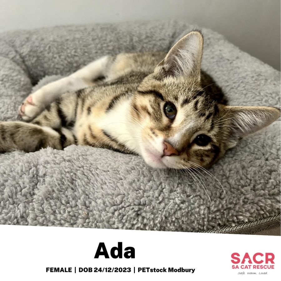 Introducing Ada, a striking and elegant feline made distinct by her unusual markings. This beautiful lady will definitely catch your eye and her charming personality will easily capture your heart.