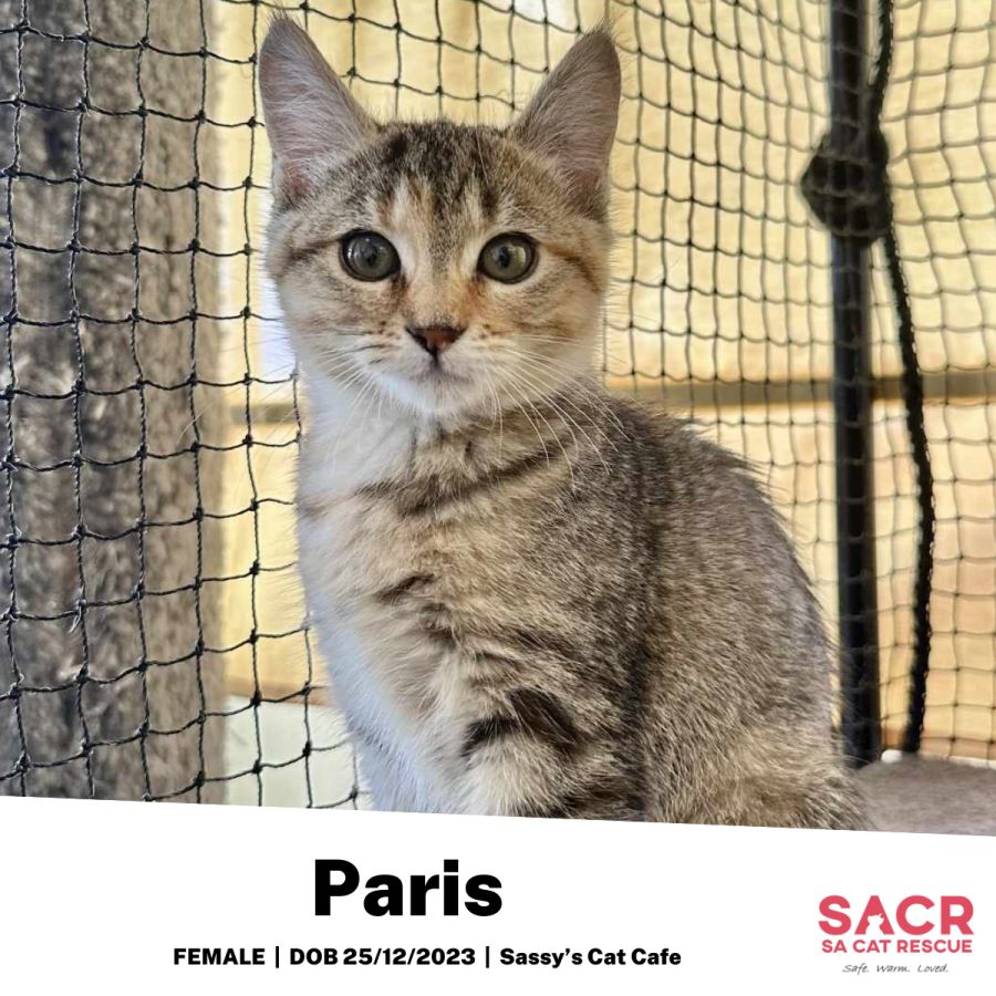 Meet Paris, a lovely kitty with the soul of an explorer and the heart of a comedian. She's the epitome of charm and will certainly keep you entertained with her lively personality.