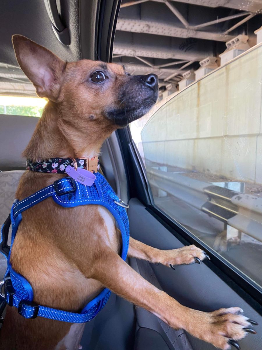 Lola is a pleasure to bring for walks which she loves, and is very excited to make new friends. She absolutely LOVES humans and the more rubs the better! The only thing she loves more than humans is going for a drive and sticking her head out the window of the car!