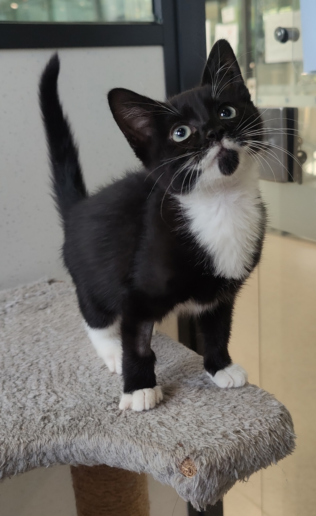 Shrimp is a delightful black and white kitten, embodying the perfect blend of sweetness and curiosity. His affectionate nature makes him an expert snuggler, always eager to curl up in your lap and purr contentedly.