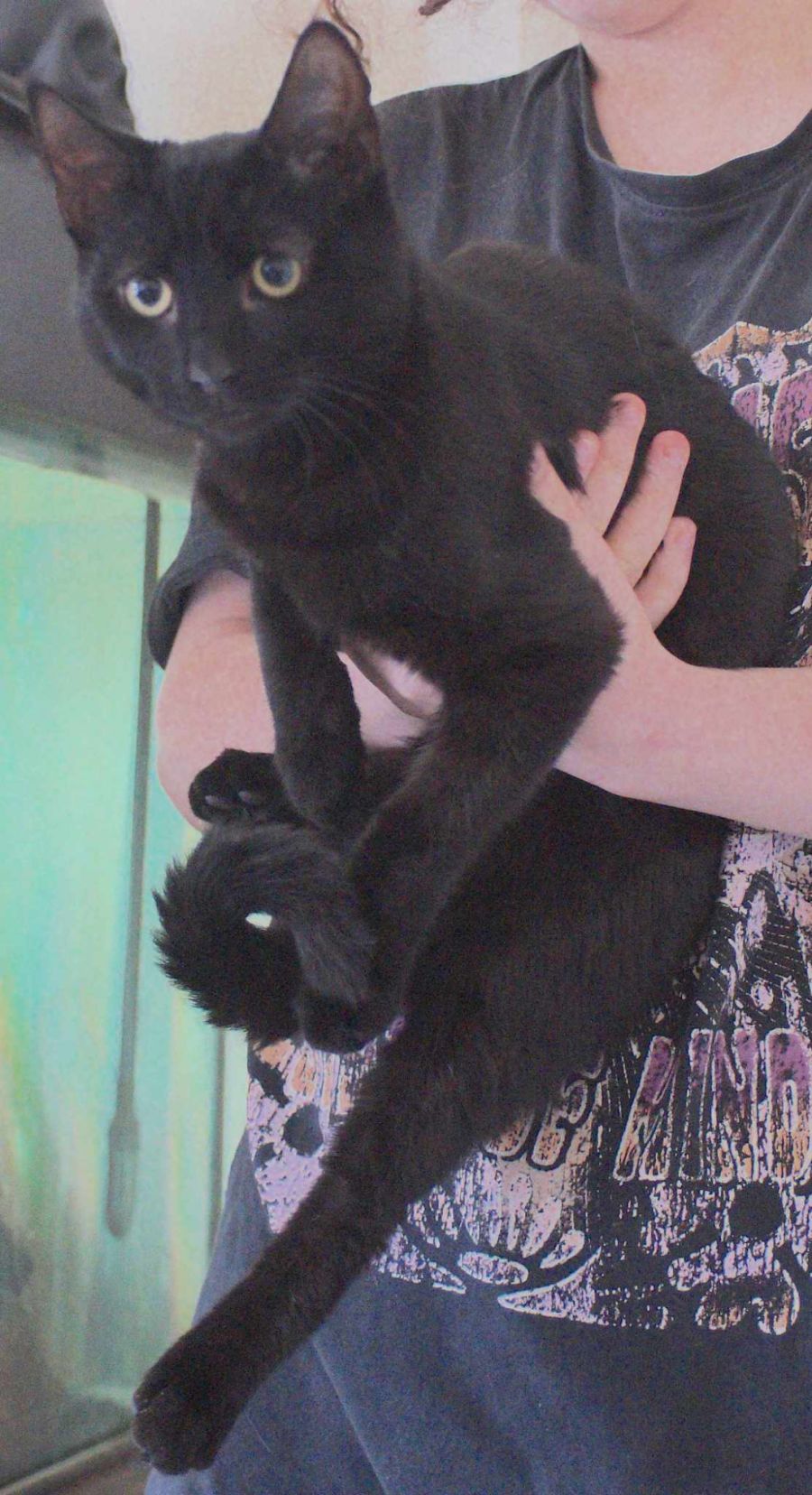 Shy at first till he knows he is safe and then is a smooch, very food motivated and loves toys and climbing. Gets along with other cats but unsure of dogs, he will probably get used to a quiet dog or a small one. Gets along with cat friendly/ respectful children