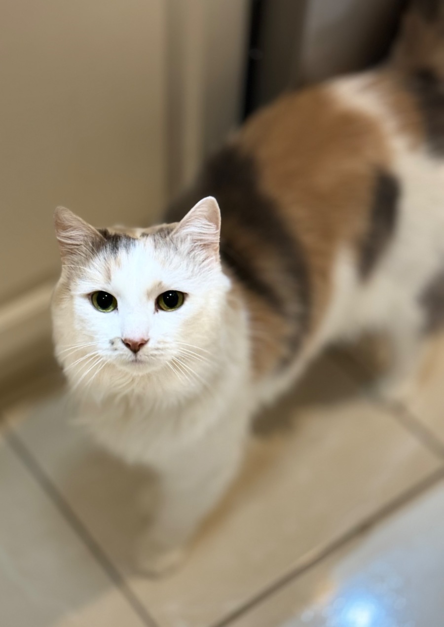 Bianca is more than just a pretty face; she's a social butterfly too. She gets along wonderfully with other cats and even enjoys the company of friendly dogs, showcasing her easygoing and harmonious personality. As a strictly indoor cat, Bianca's days are filled with contentment nibbling on her Royal Canin kibbles and savoring a daily tin of wet food, so she appreciates good food and delectable treats.