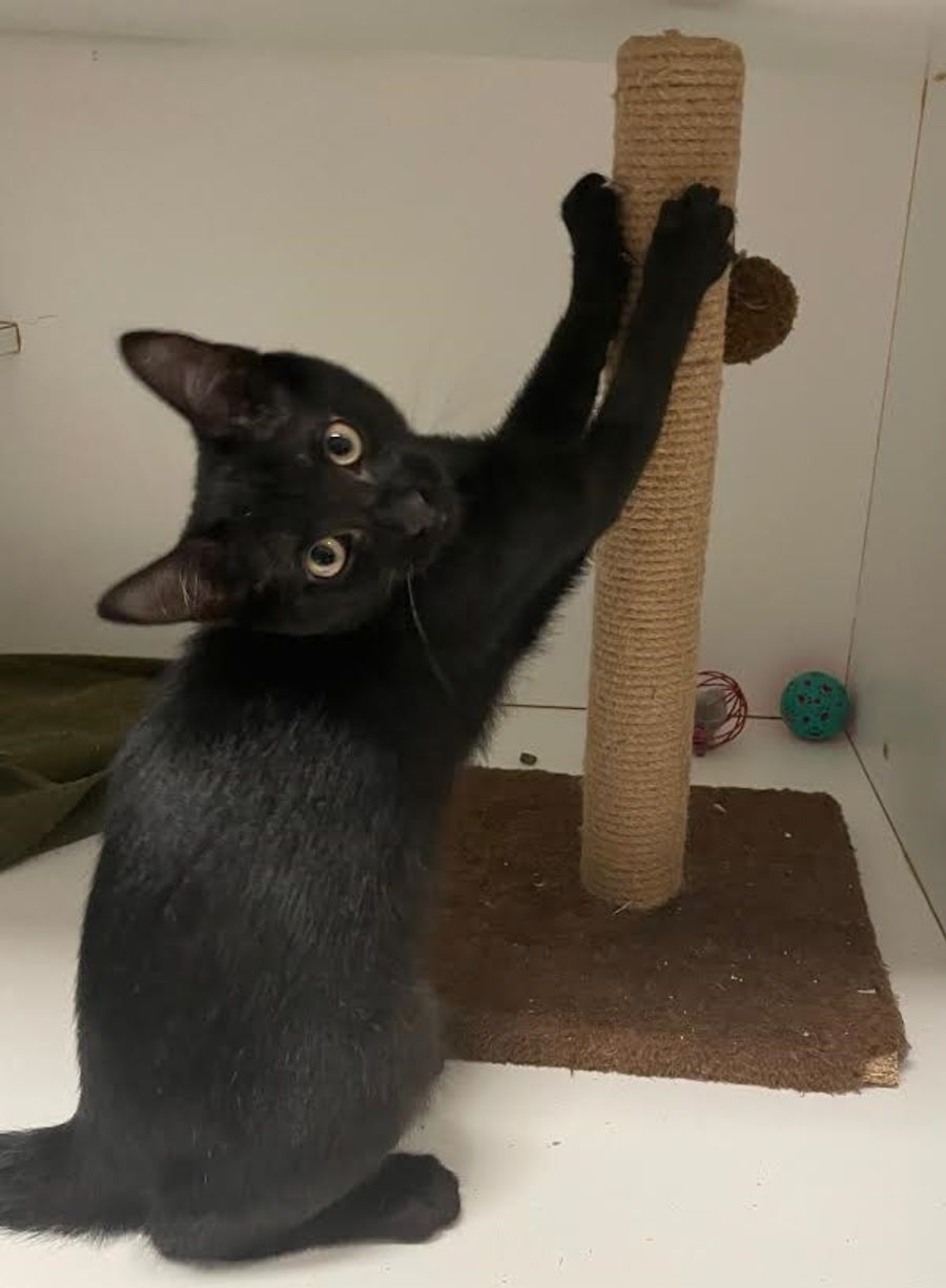 Introducing the delightful and dynamic Mouse! This energetic, playful black kitten is a whirlwind of fun and always a pleasure to have around.