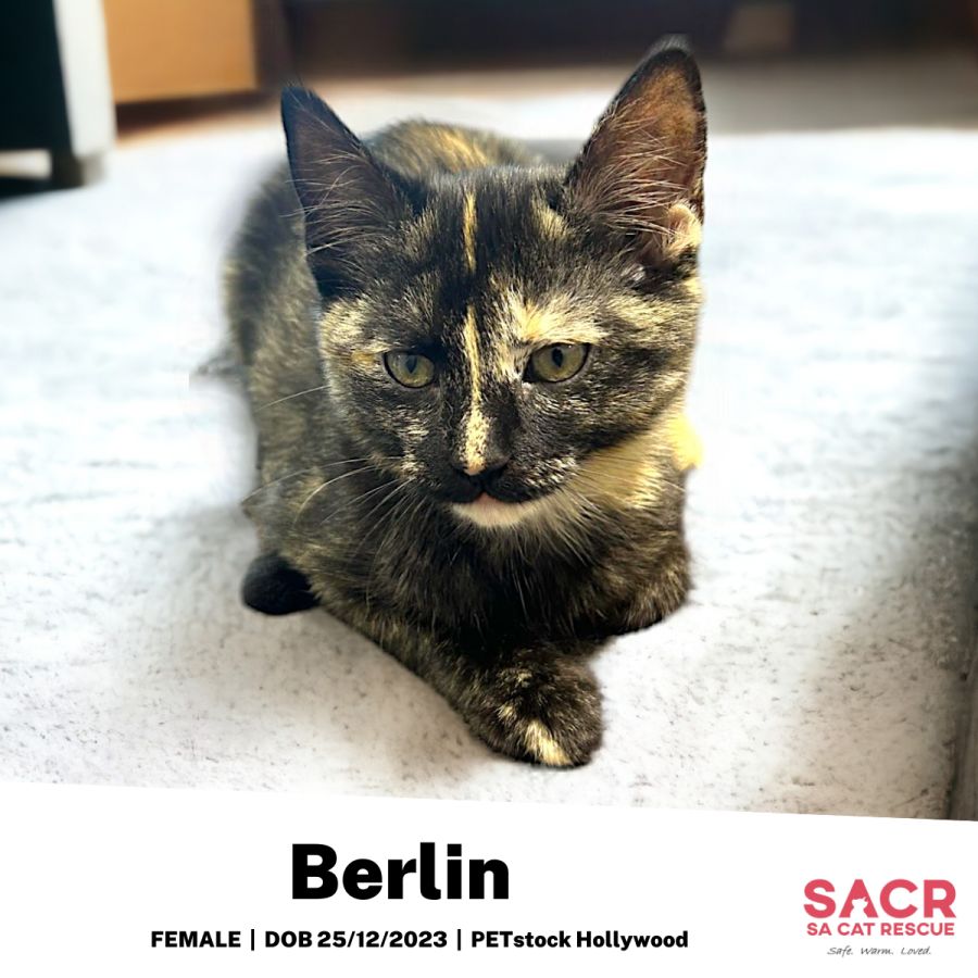 Berlin’s adoption fee is $180 which includes desexing, microchipping, parasite prevention, and initial F3 vaccination.