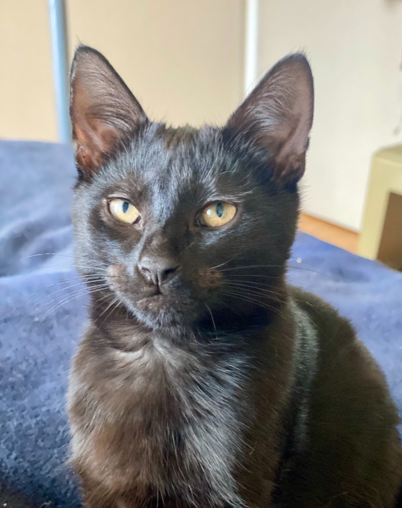 Mayhem is a sleek, pure black male kitten, resembling a miniature panther. He is a bit more outgoing than his brother. Affectionate, sweet-natured, and sociable, Mayhem connects with people very easily. He loves to look you in the eye and waggle his paws, enticing you to play with him. Always eager for interaction, Mayhem enjoys cuddling and is often closely followed by Havoc.