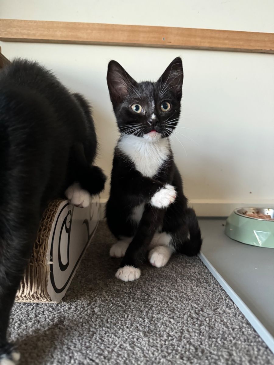 Venus is socialized with kittens & adult cats. She is still working out the family dog, but being a kitten still it won’t take her long to fit into your home. She would be best suited to a household with another feline friend or where her humans are home a lot. She’s a great match if you are looking for a companion cat.