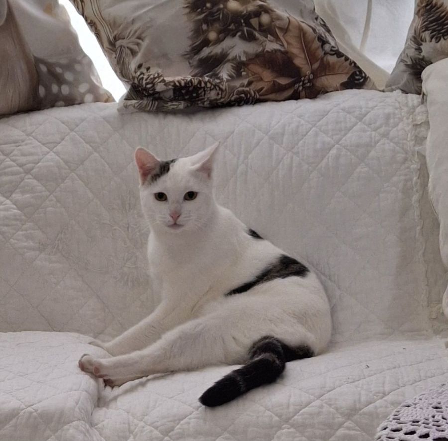 This sweet girl, Flora, is a stunning white kitty with some unique dark markings searching for her Furever happily ever after!
