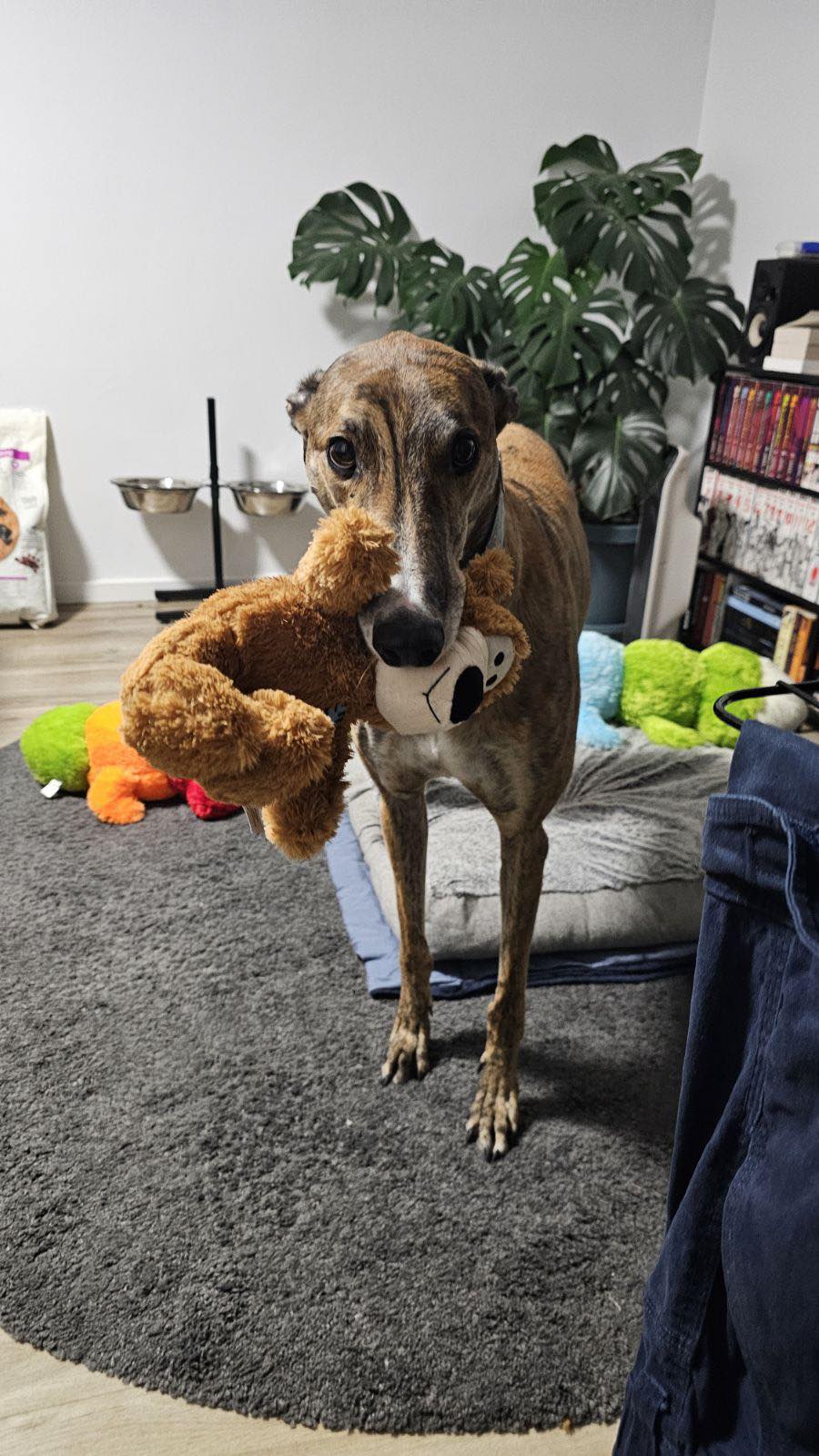 Bob’s a big fan of soft squeaky toys and will often carry one around the house with him before settling in bed. He enjoys a short run around or zoomies and walks followed by a longgg nap.