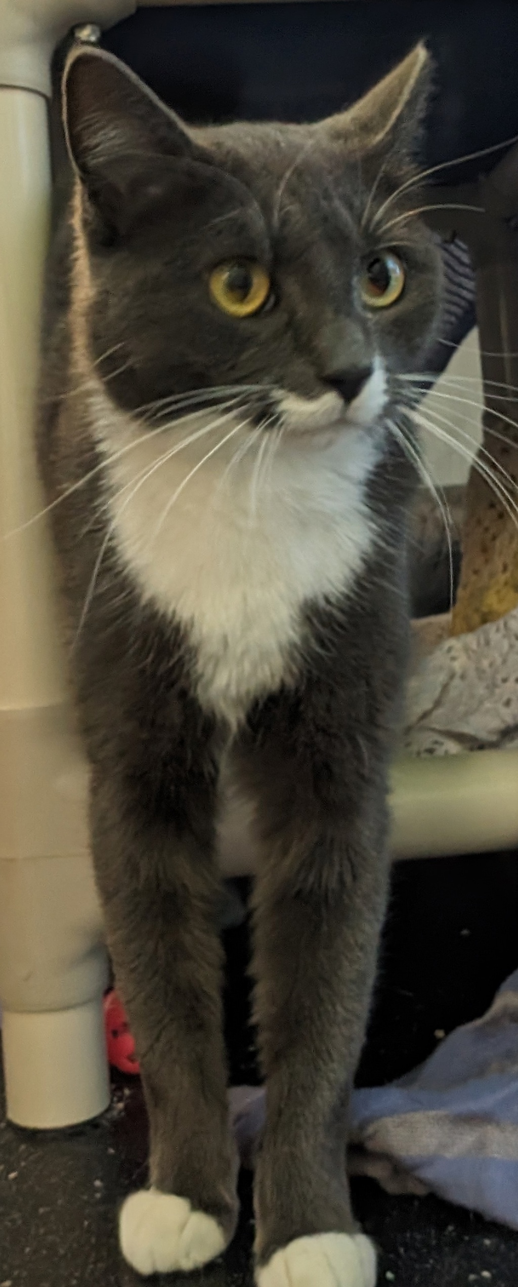 Meet Peekaboo, the enchanting grey and white Domestic Shorthair with a heart as soft as her fur. Rescued from a cozy farm life, Peekaboo brings a dash of country charm to her new home. At first glance, she might seem a tad shy, but beneath that initial hesitation lies a treasure trove of affection waiting to be discovered.