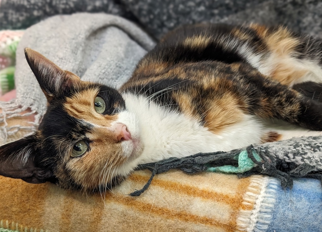 Meet Loretta, the epitome of chill in the world of Torti and White kitties. With a fur coat that's a delightful blend of colors and patterns, she effortlessly captures hearts with her undeniable cuteness. Loretta is no stranger to the spotlight; in fact, she adores attention and basks in it like a true diva.