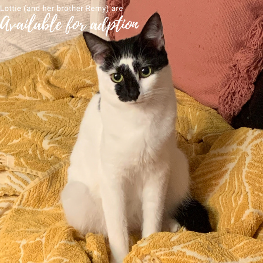 This is Lottie! She is a very photogenic beauty with unusual markings and a sweet little white spot at the end of her tail, like an exclamation mark. With a mix of sass, confidence, and gentleness, her foster home has found her an easy cat to love!