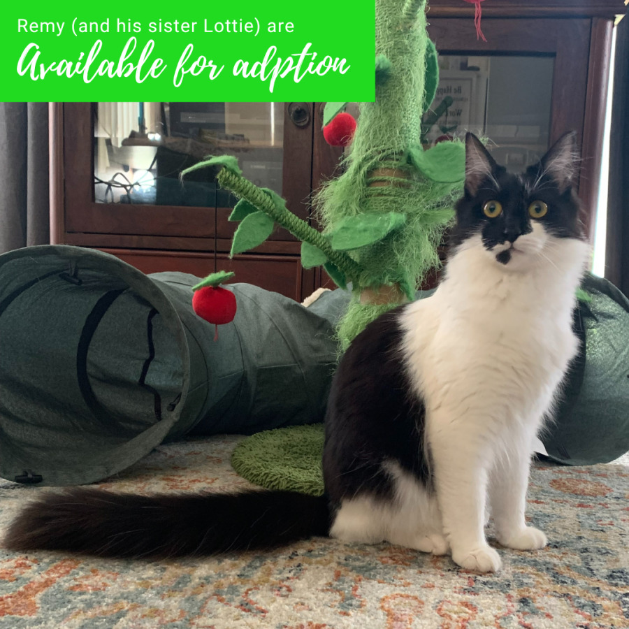 This clever boy knows when itโs bedtime, often claiming the prime spot in the middle of the bed to snuggle up for the night. Heโs also a bit of a social butterfly with his feline friends in foster care, enjoying wrestling matches and games with wand toys. And like many of us, when itโs treat time, Remy is all ears and ready to get his share!