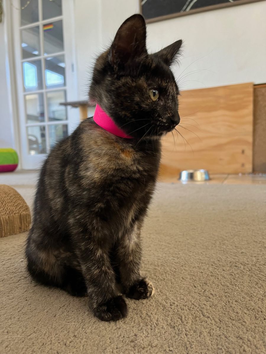 Heidi is a beautiful 12wo dark tortoiseshell female kitten. Heidi is the only female and only tortoiseshell pattern of her litter mates, who are all variations on black and white. She has flourished in foster care with another pair of tortoiseshell girls, as she is more reserved than her brothers. Playful and relaxed. Because of her calm nature, Heidi is not suited to a household with young children or highly dominant pets, but if you have room in your heart and home for two rescue kittens please consider adopting Heidi with her female foster friend Tarsier or brother Spaghetto (see PR for profiles). They have all been desexed, microchipped, vaccinated, wormed and flea-treated and are waiting to meet you in Beaumaris 3193