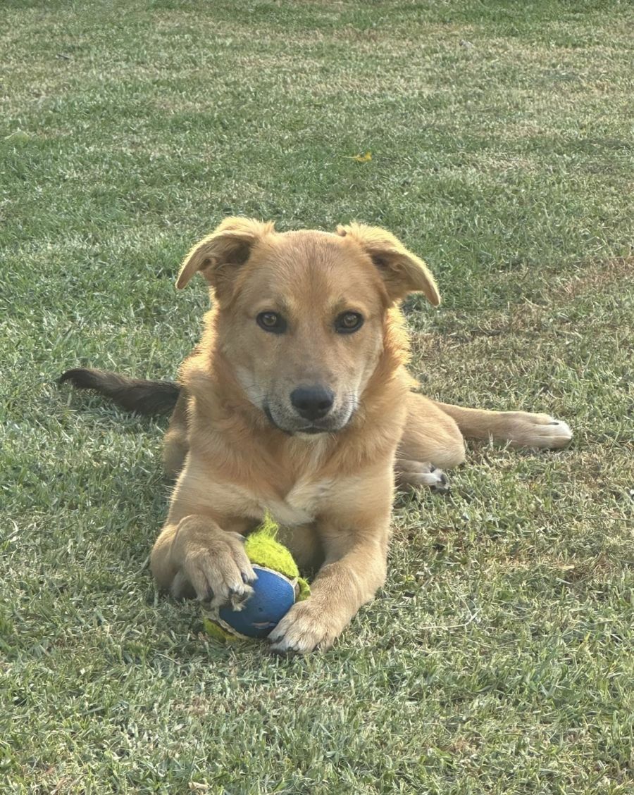 The vet says I’m a golden retriever x kelpie and I’m about 6 months old now and growing every day I get told. I have two big German shepherd foster brothers who I love playing with and biting their back legs then I run away for a game of chasey. Don’t tell them but I’m faster than them at running ! We tumble and play fight and sometimes I jump on them and squish them. Play fighting is so much fun !