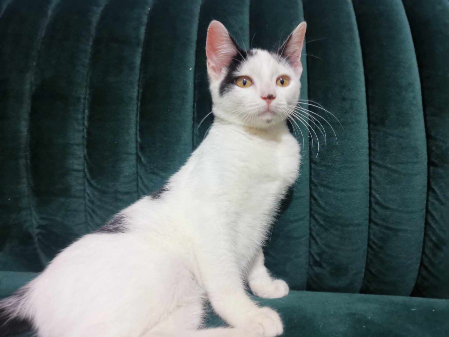 Bunny is a beautiful black and white kitten. She has a moo coat which looks gorgeous and is a little uncommon. Bunny was found on Easter hence the name. She is shy and it takes time for her to come over to us but once we have picked her up, she is immediately purring and will happily stay cuddled on our lap and sleep. She will gently tap to remind us that we need to continue the patting session and the purring doesn't stop until she sleeps.