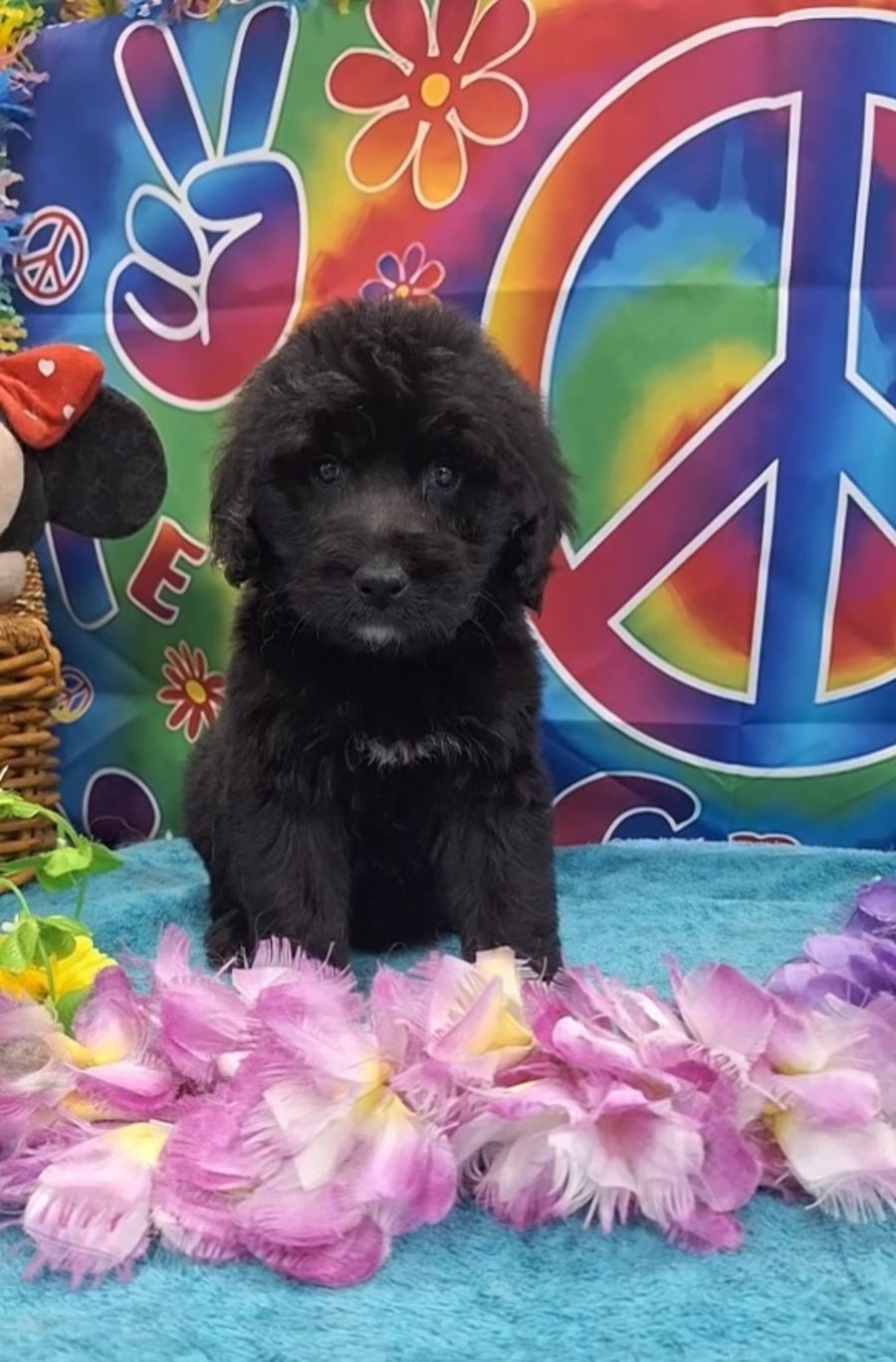 This gorgeous puppy is Flint, a Bordoodle pup born 9 March 2024. He's part of a litter of 3 who came to us for care.