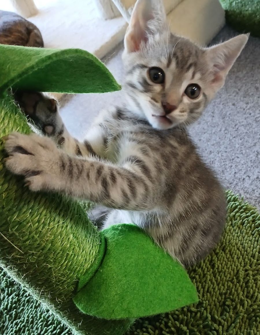Meet Dino, a playful little guy with a beautiful light grey fur that's as soft as silk. As a sociable feline, Dino mixes well with his fellow cats, displaying an easy-going demeanor that makes him a delightful companion.