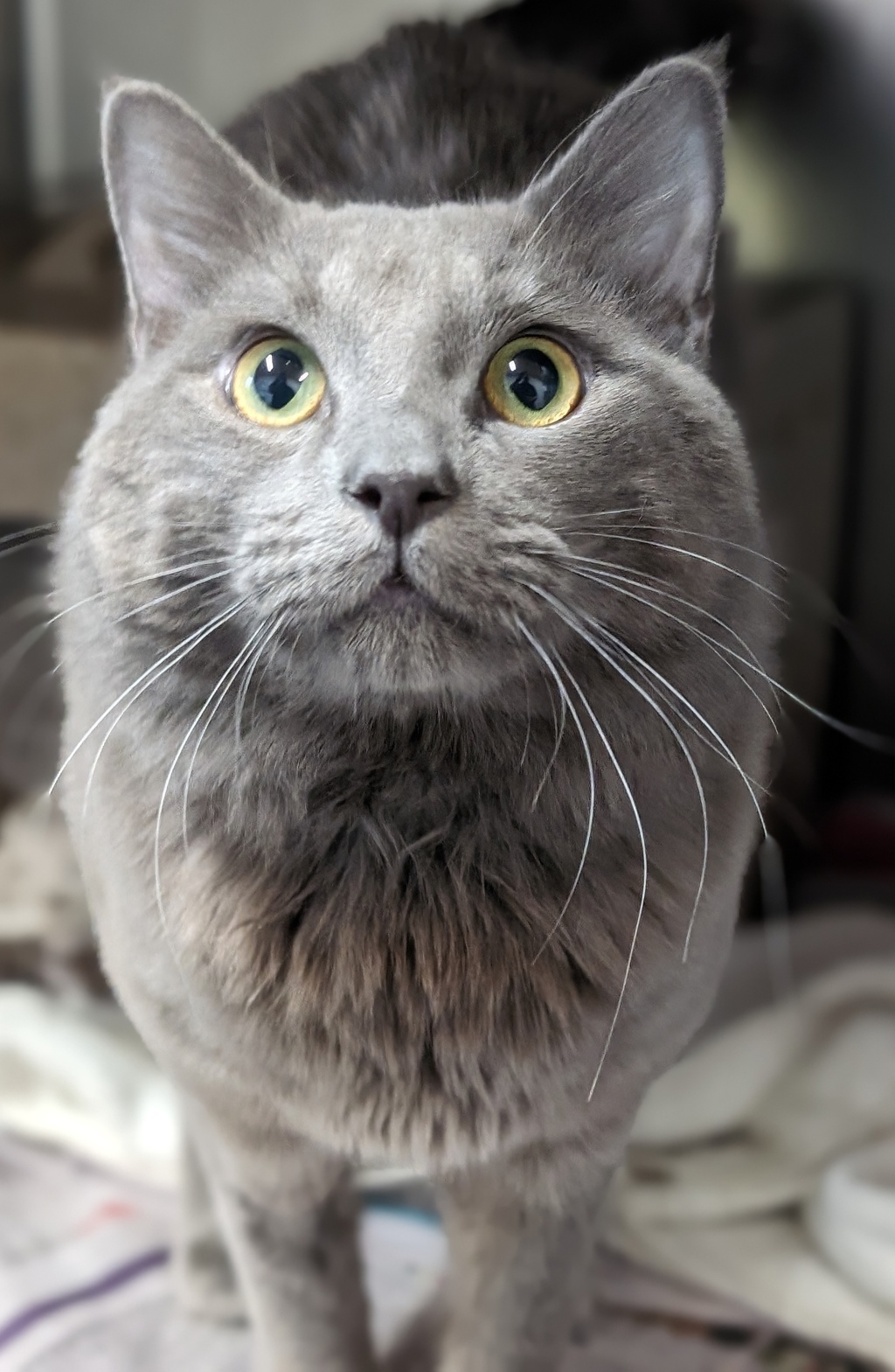 "Hey there, pals! The name's Cosmo, and let me tell ya, I'm one cool cat. With my sleek grey fur and mesmerizing eyes, I've got the looks that'll make your heart skip a beat.