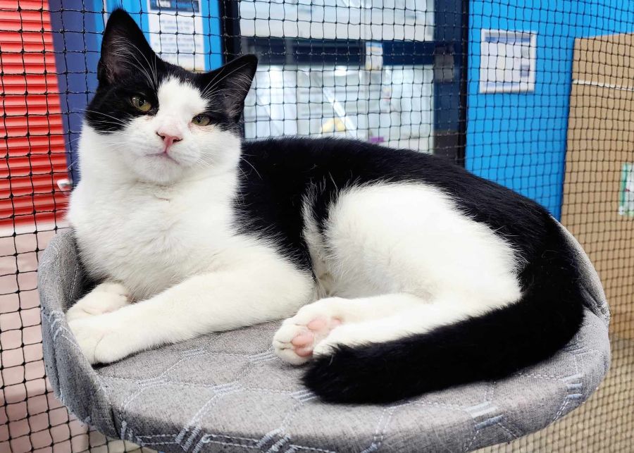 Hes a little purring machine and just loves snuggles and pats from the humans. He'll also entertain himself by playing with other kitties or playing on toys.