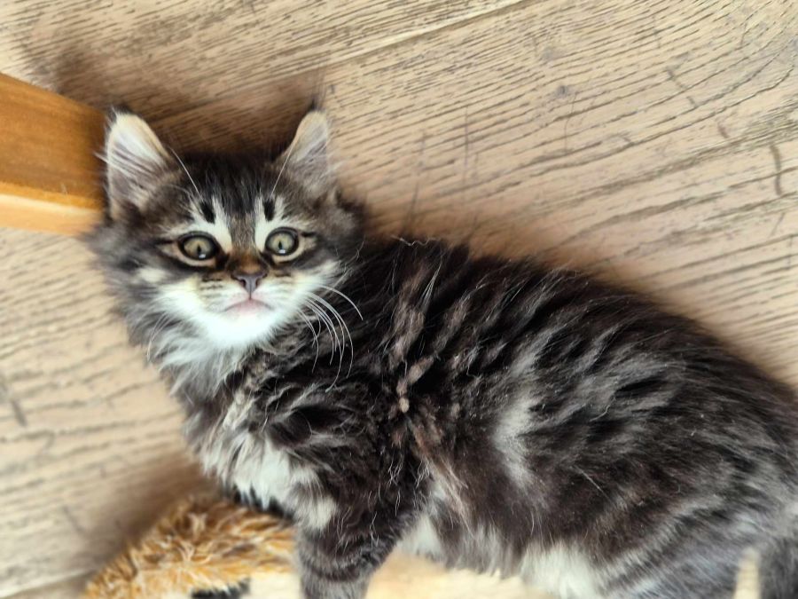 He is a beautiful fluffy boy with a great easy going personality. He’s currently living with dogs and cats and he’s gentle around children.