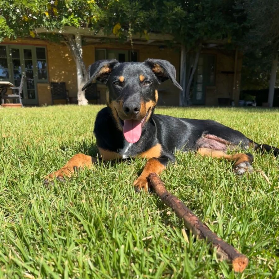 Note: Triton’s leg was amputated following a tangle with a farm fence that resulted in a badly broken back leg. He is coping very well as a tripawd but his new family will need to continue to help him adjust to life on 3 legs.