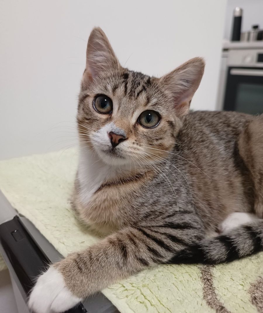 Lara is a very sweet kitten and loves cuddles but will take time to warm up to new people. Once settled, she is affectionate and follows her human around the house. She enjoys napping on your lap and will sleep on your desk while you work – definitely one of her favourite things to do!