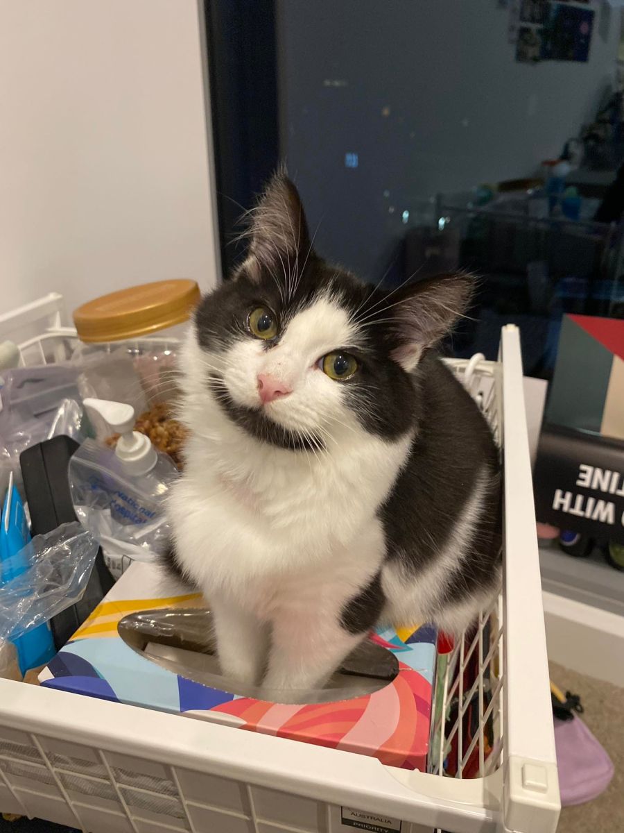 Other than a few days of hissing, Hebe settled down well with the two other cats! She's a super adaptable little one with lots of love to give. Speaking of love, Hebe alternates between being a maternal figure and a crazy terror. You'll catch her aggressively grooming the two cats and giving them the biggest hugs while doing so. And when the zoomies hit - she'll chase everything and anything around the house (much to the demise of the other two foster cats). One thing to note though - avoid using sandy-textured litter for your litterbox if you choose to adopt Hebe. That little one took it as her personal sandbox and loved sleeping in it - so we had to swap to tofu/paper litter.