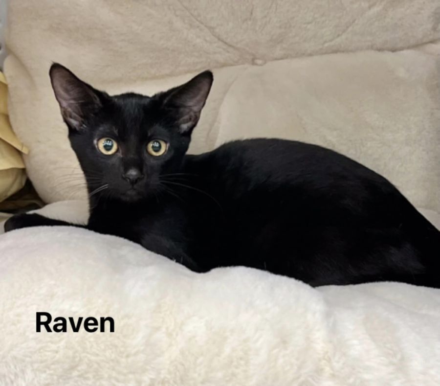 Raven is beautiful and sleek, with a tiny star burst on her chest. She is full of energy and curiosity!