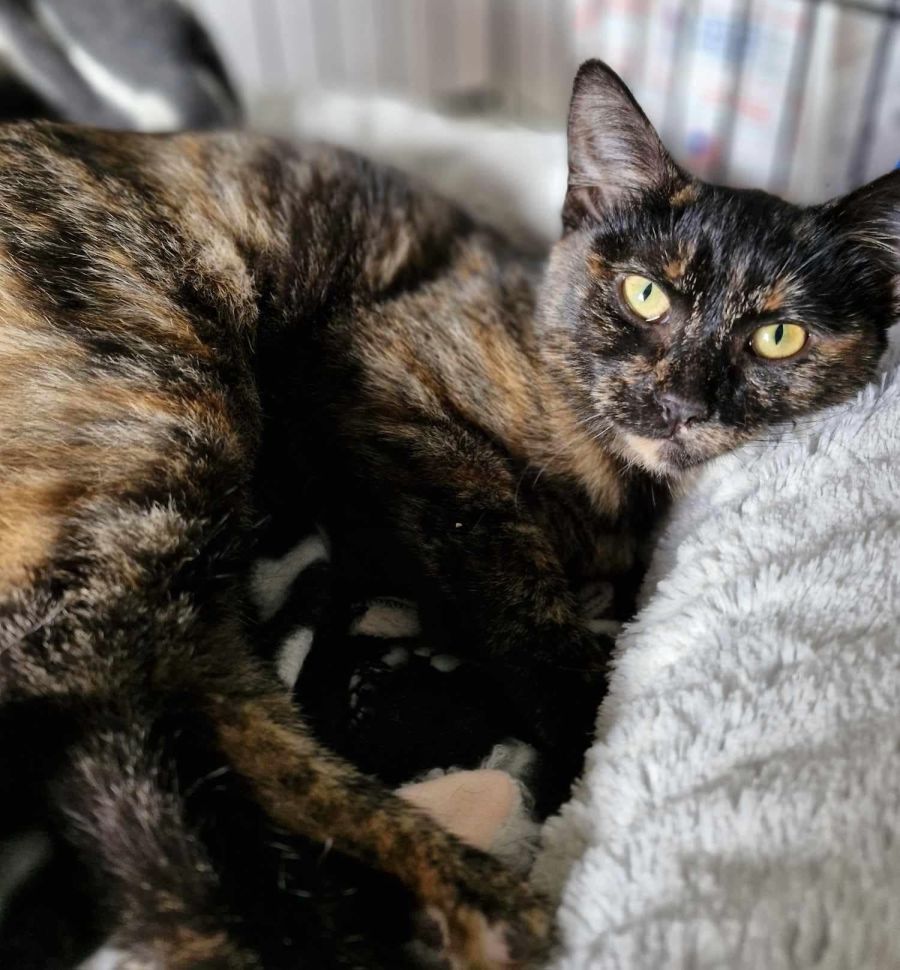 This stunning torti girl was found trapped at a factory with some other cats. Because of this, she’s still learning to trust humans and can be a little bit spicy when she doesn’t want attention.
