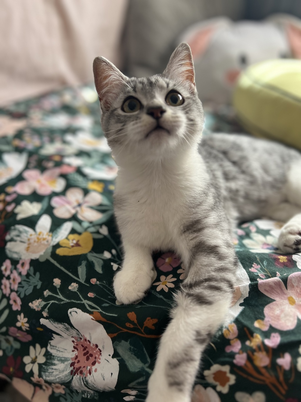 Finn is outgoing, curious, playful and cuddly. He has absolutely no boundaries and will climb right onto your plate of food while you are eating it and would not hesitate to take the food right out of your mouth. No joke... he may need some boundaries set around mealtimes... He is very clever and has his foster carer wrapped around his little paw, which he often uses to grab things right out of your hands. He is great with dogs, playing and snuggling up with them for naps. Finn has a very sweet meow and chirp, which he is happy to use to remind you about meal times! As it has gotten colder Finn has learnt that snuggled up under the blanket is a good to be, making him the best cuddle companion.