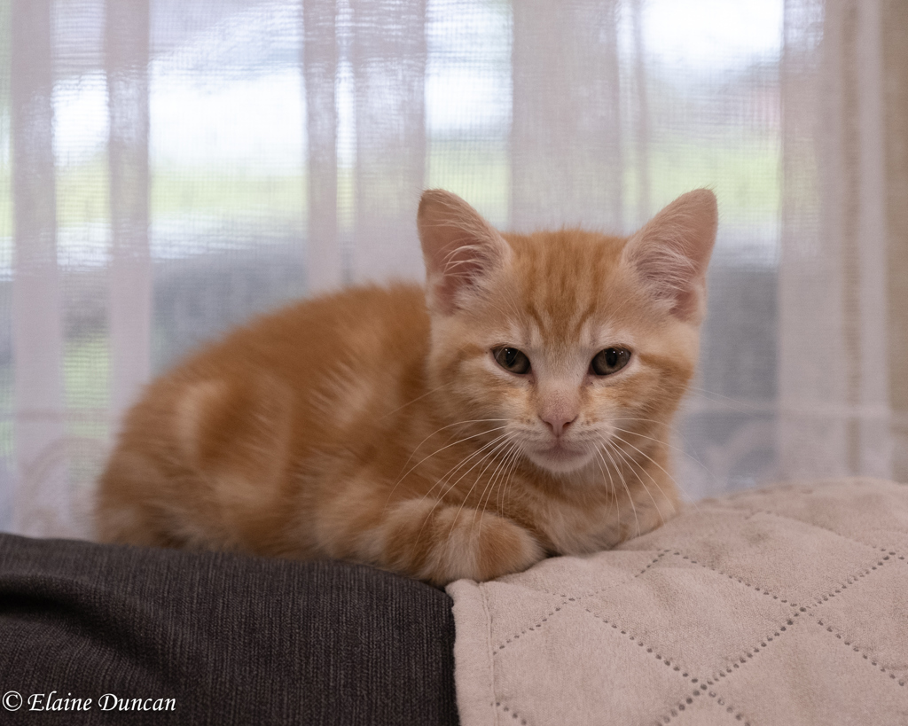 Milo is a rather inquisitive little fellow who likes to know everything that's going on and can often be found perched atop the backrest of the couch so he can see everything happening in every direction, even out the window. He is also excellent at finding any warm sunbeams that shine in through the kitchen windows to bask in contentedly. But his favourite napping spot is nestled up next to his humans, happily accepting tummy rubs and purring loudly.