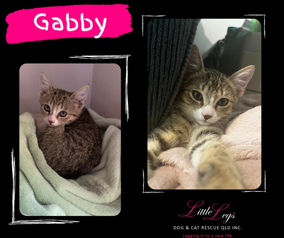 Hello everyone, my name is Gabby and I'm looking for my forever home. I was found alone on a farm before coming to live with my foster family and foster kitten brother. I can be shy around people but when I get to know you I will come and sit next to you so I can have pats and snuggles. I really enjoy games with toys and racing around all the rooms. I love my food and have learned how to use the litter tray. My foster family says I have the sweetest little face with big, beautiful eyes and white patches on my fur. Hope to meet you soon!