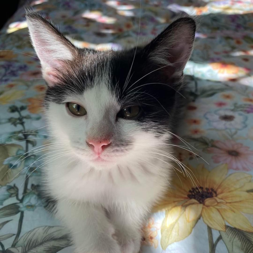 Penguin is a happy, confident little guy who loves a good zoomie around the house. He adores a snuggle with his sister, Zebra, and is a big fan of snuggles at nap time. He has some beautiful markings and fabulous white fur that sticks out through the black. He has a very loud purr to let you know how contented he is.
