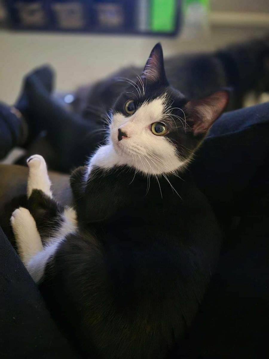 JD is our little shoulder cat! She seeks out the perfect vantage point at any given opportunity, transforming your shoulders into her custom throne. Whether you're standing, sitting, or walking around, you'll feel a soft and tender touch on your shoulder that's just JD making herself comfortable.