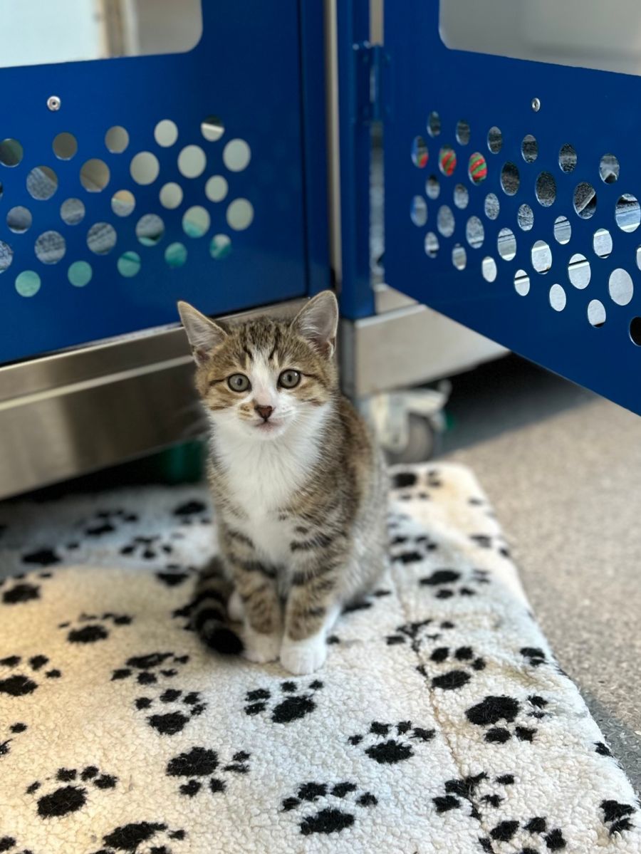 Vanessa is a playful, mischevious little kitten who was born in a vet clinic after her mum was rescued from the street. She is playful & loves tumbling around with her siblings. She is gradually gaining confidence with people and is progressing well.