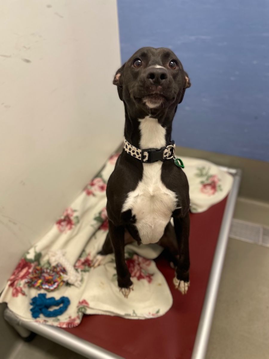 While Sox is dog-social, she would thrive best either as the only dog or with a companion of similar size and energy levels, preferably a friendly male. Although she hasn’t shown much playfulness at the shelter, her playful side is sure to emerge in the right home environment.