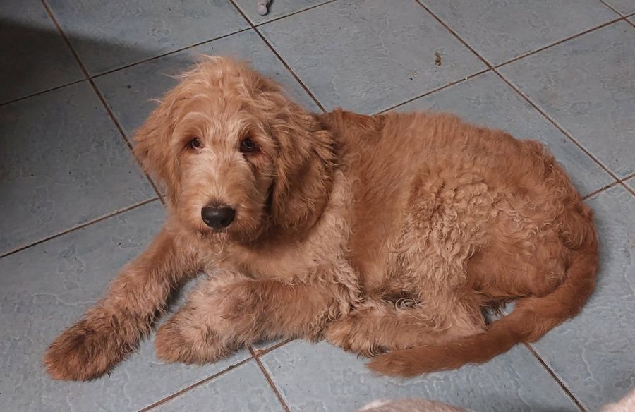 He s a 5 month old Groodle, and is 18 kilo s he s big, he s gorgeous, and he a great big cuddly puppy !!