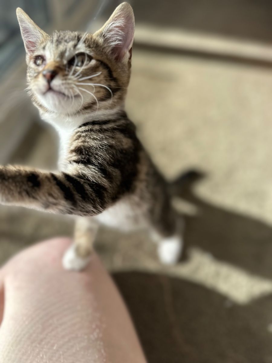 Bridget is a cheeky tabby and white girl whose favourite thing is to climb onto peoples shoulders for the better view, and to better nuzzle your face. She is very confident and runs to greet her foster parents as soon as they enter the room.